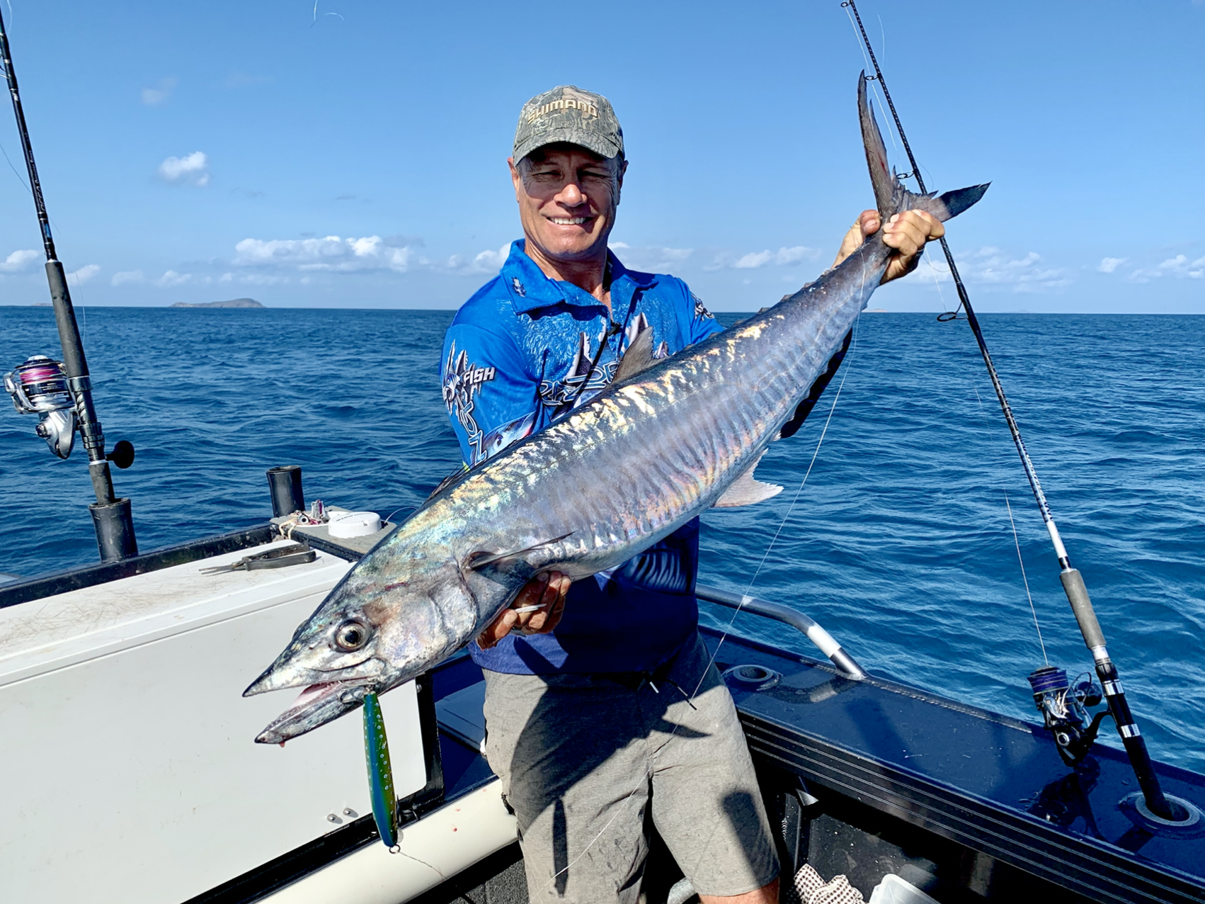 We decide to pull in the Shimano Coral Trout tackle and troll for Mackerel around the rocky island with shallow diving Lures.